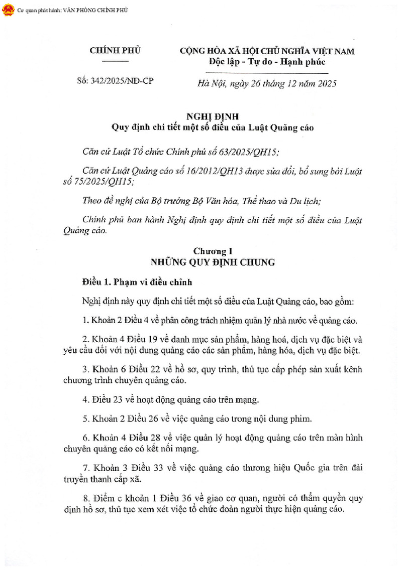 | Tiêu đề văn bản | Nghị định số 342/2025/NĐCP ngày 26 tháng 12 năm 2025 của Chính phủ quy định chi tiết một số điều của Luật Quảng cáo | ||
