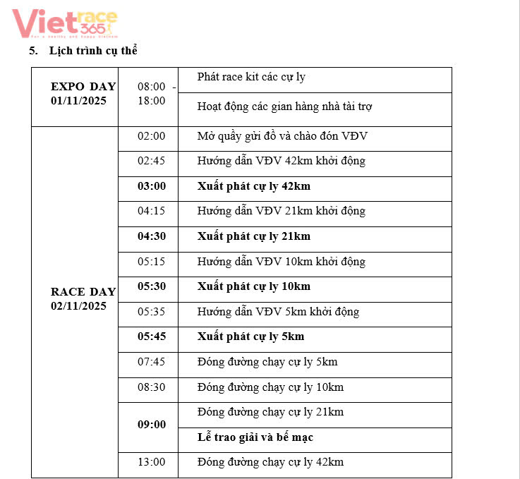 - Ngày chạy chính thức giải: xuất phát các cự ly bắt đầu từ 03h00 sáng và kết thúc đường chạy tất cả các cự ly vào 13h00 ngày 02/11/2025 (* thời gian thi đấu có thể thay đổi theo tình hình thực tế)