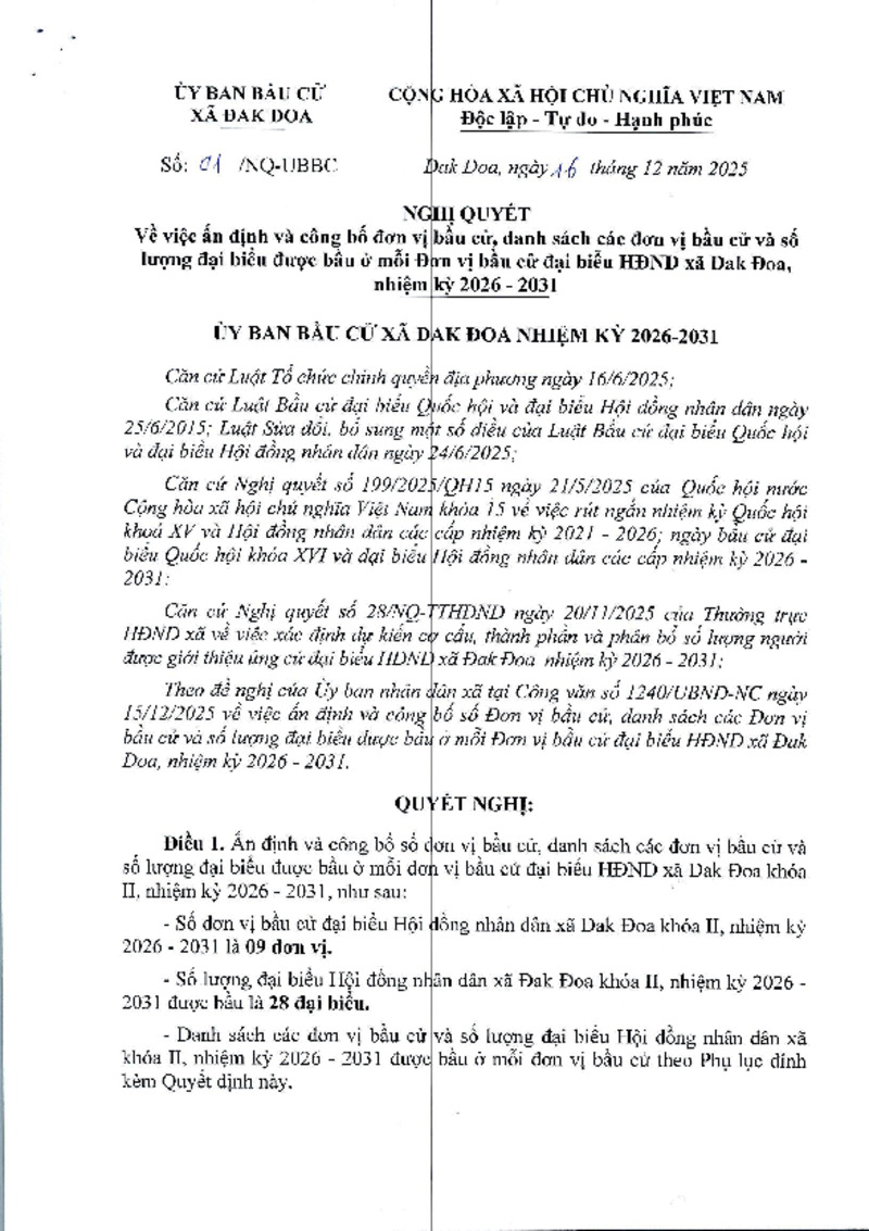 | Tiêu đề văn bản | NGHỊ QUYẾT Về việc ấn định và công bố đơn vị bầu cử, danh sách các đơn vị bầu cử và số lượng đại biểu được bầu ở mỗi Đơn vị bầu cử đại biểu HĐND xã Đak Đoa, nhiệm kỳ 2026 – 2031 | ||