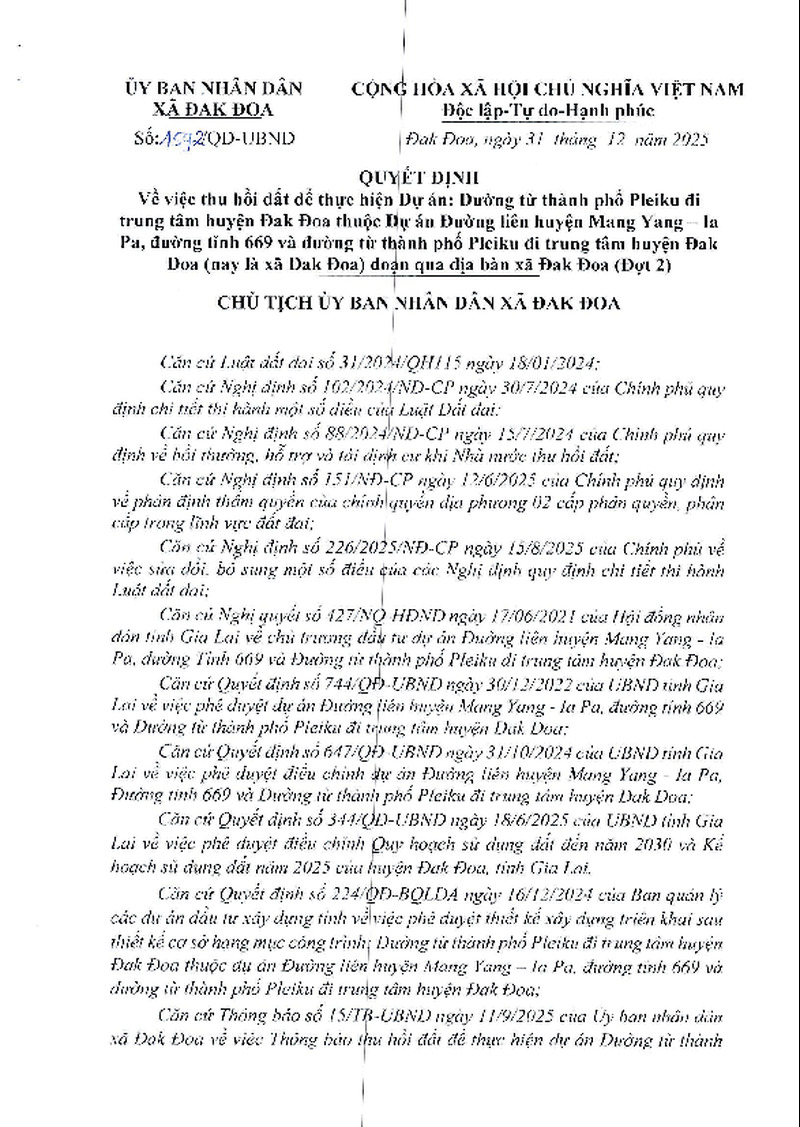 | Tiêu đề văn bản | Quyết định Về việc thu hồi đất để thực hiện Dự án: Đường từ thành phố Pleiku đi trung tâm huyện Đak Đoa thuộc Dự án Đường liên huyện Mang Yang – Ia Pa, đường tỉnh 669 và đường từ thành phố Pleiku đi trung tâm xã Đak Đoa) (Đợt 3) thôn Ngol | ||
