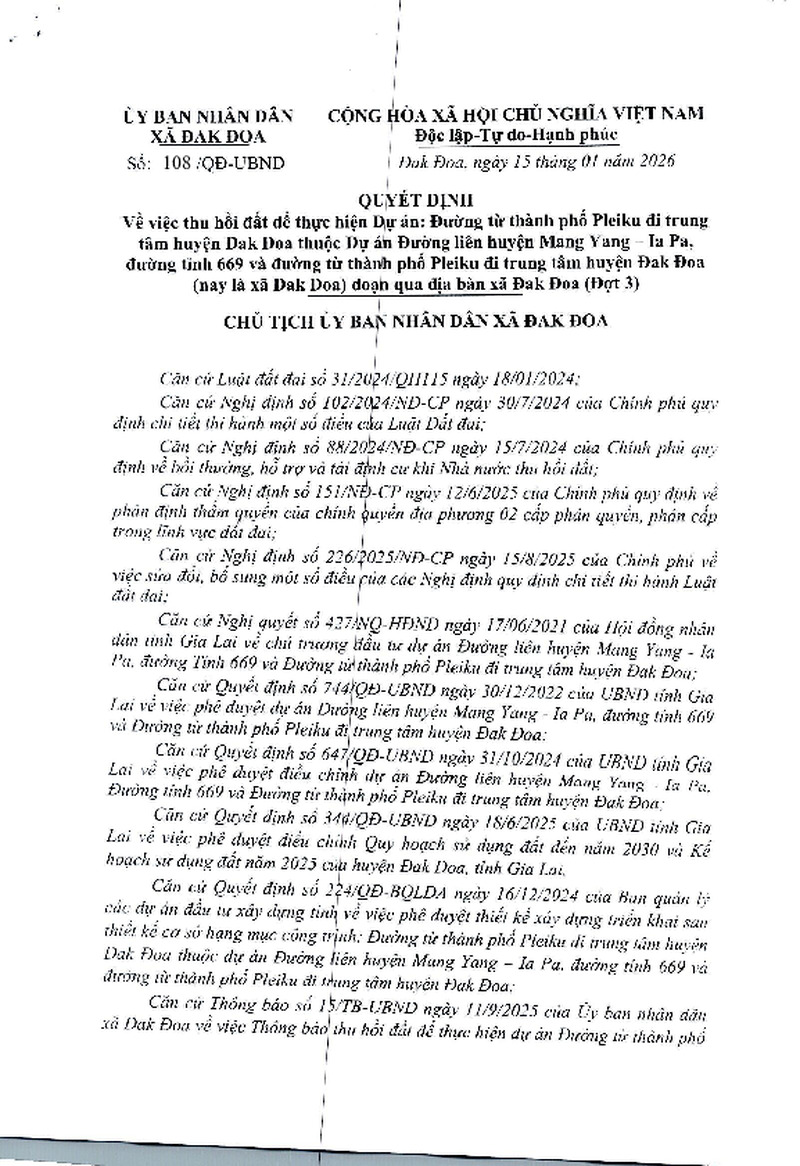 | Tiêu đề văn bản | Quyết định Về việc thu hồi đất để thực hiện Dự án: Đường từ thành phố Pleiku đi trung tâm huyện Đak Đoa thuộc Dự án Đường liên huyện Mang Yang – Ia Pa, đường tỉnh 669 và đường từ thành phố Pleiku đi trung tâm xã Đak Đoa) (Đợt 3) hộ R'Mah YWăn | ||