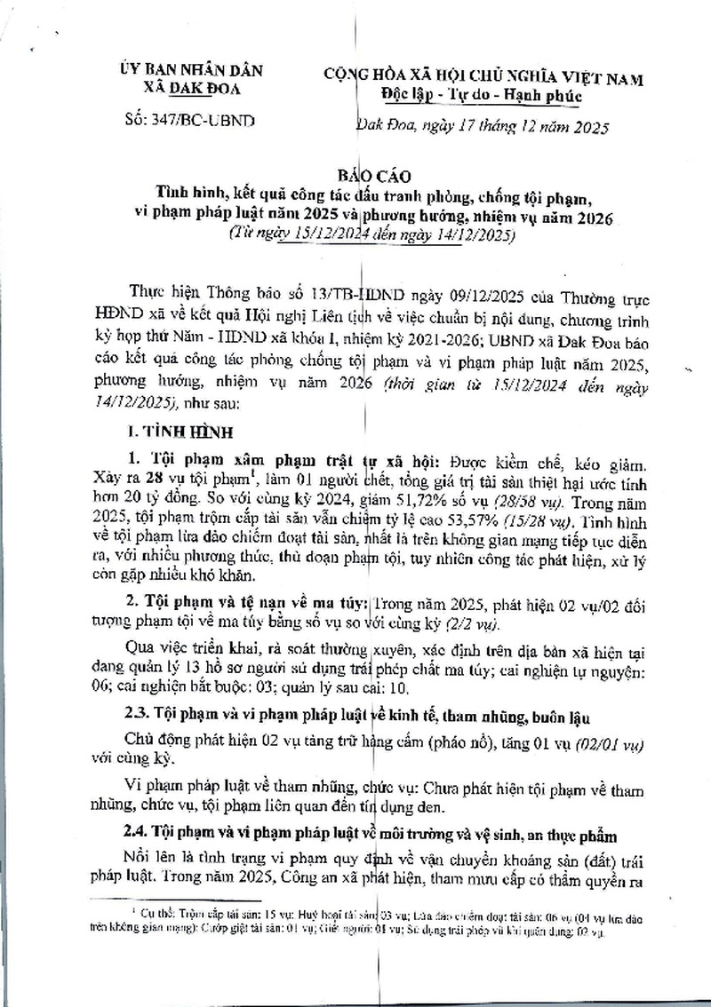 | Tiêu đề văn bản | Báo cáo tình hình kết quả công tác đấu tranh phòng, chống tội phạm vi phạm pháp luật năm 2025 và phương hướng nhiệm vụ năm 2026 | ||
