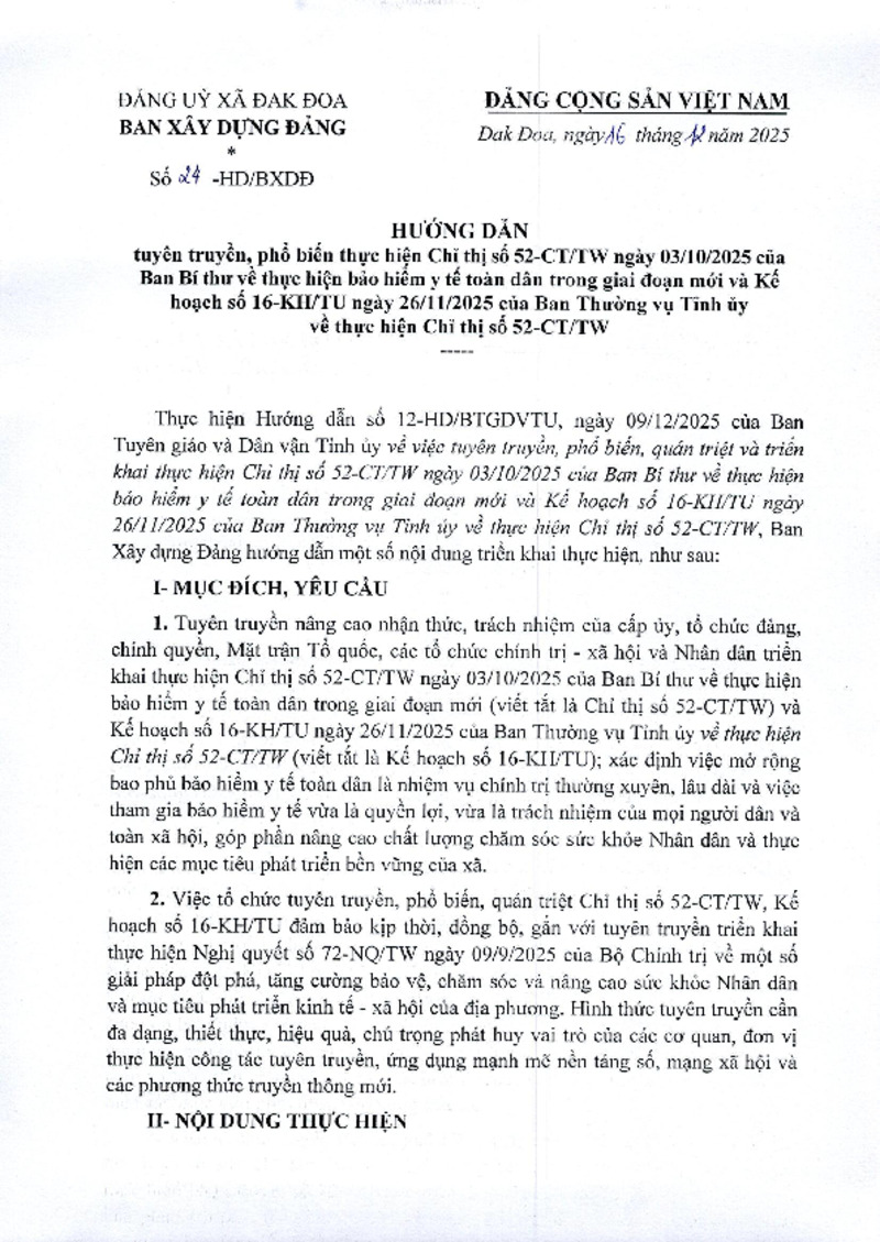 | Tiêu đề văn bản | Hướng dẫn tuyên truyền, phổ biến thực hiện Chỉ thị số 52-CT/TW ngày 03/10/2025 của Ban Bí thư về thực hiện bảo hiểm y tế toàn dân trong giai đoạn mới và Kế hoạch số 16-KH/TU ngày 26/11/2025 của Ban Thường vụ Tỉnh ủy về thực hiện Chỉ thị số 52-CT/TW | ||