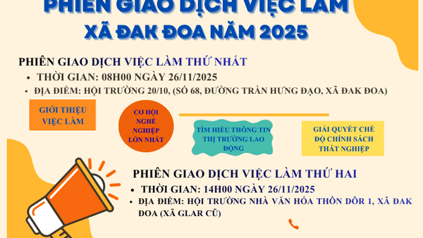 (dakdoa.gialai.gov.vn) UBND xã Đak Đoa thông báo đến toàn thể người lao động trên địa bàn xã về phiên giao dịch việc làm. Nơi tìm kiếm cơ hội việc làm ổn định, nắm bắt thông tin thị trường lao động ...