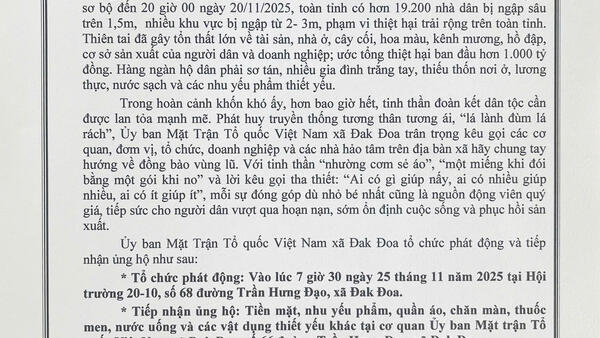 Ủy ban Mặt trận tổ quốc Việt Nam xã Đak Đoa kêu gọi Nhân dân ủng hộ Nhân dân bị thiệt hại do bão lũ