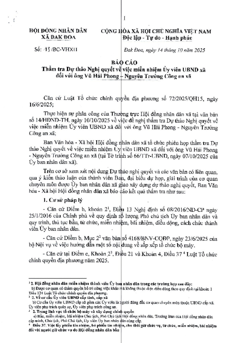 | Tiêu đề văn bản | Báo cáo thẩm tra dự thảo Nghị quyết về việc miễn nhiệm Ủy viên UBND xã đối với ông Vũ Hải Phong- Nguyên trưởng công an xã | ||