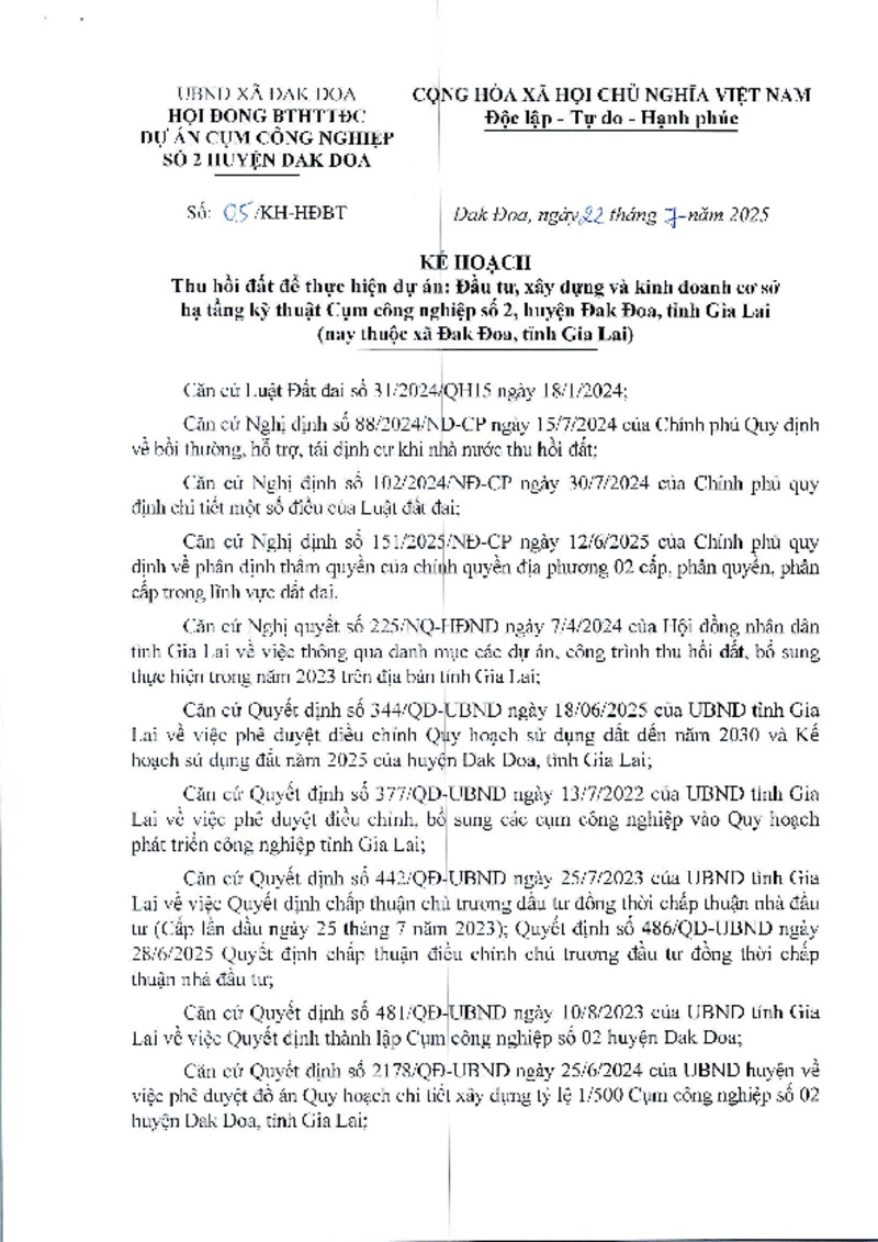 | Tiêu đề văn bản | Kế hoach thu hồi đất để phục vụ dự án: Đầu tư, xây dựng và kinh doanh cơ sở hạ tầng Cụm Công nghiệp số 2 | ||
