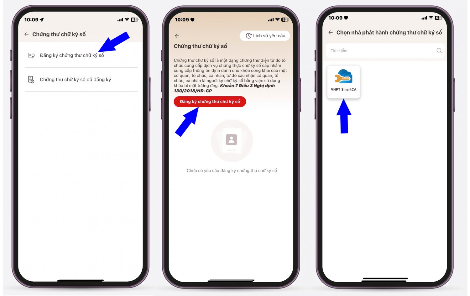 Bước 4: Trong cửa sổ mới hiện ra, người dùng chỉ cần chọn Đăng ký chứng thư chữ ký số - VNPT SmartCA - Nhập passcode. Sau đó đánh dấu vào ô "Tôi đồng ý với Điều khoản sử dụng dịch vụ và Chính sách quyền riêng tư của VNPT SmartCA" và bấm "tiếp tục".