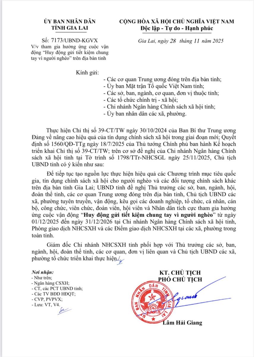 Ủy ban nhân dân xã kêu gọi các doanh nghiệp, tổ chức, cá nhân, cán bộ, công chức, viên chức, đoàn viên, hội viên và Nhân dân tích cực tham gia hưởng ứng cuộc vận động “Huy động gửi tiết kiệm chung tay vì người nghèo” từ ngày 01/12/2025 đến ngày 31/12/2026 tại Chi nhánh Ngân hàng Chính sách xã hội tỉnh, Phòng giao dịch NHCSXH và các điểm giao dịch NHCSXH tại xã Đak Đoa.