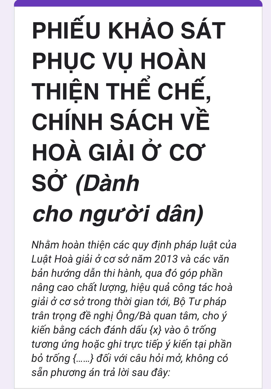 Để tham gia khảo sát nhằm phục vụ xây dựng, hoàn thiện thể chế, chính sách về hòa giải cơ sở. Người dân (từ đủ 18 tuổi trở lên ) trên địa bàn xã tham gia khảo sát theo đường link dưới đây: https://docs.google.com/forms/d/e/1FAIpQLSc557O5fjRBXRlARtUKQTwC9qsR-g1f5JUb718oSevl5oJs6g/viewform?pli=1