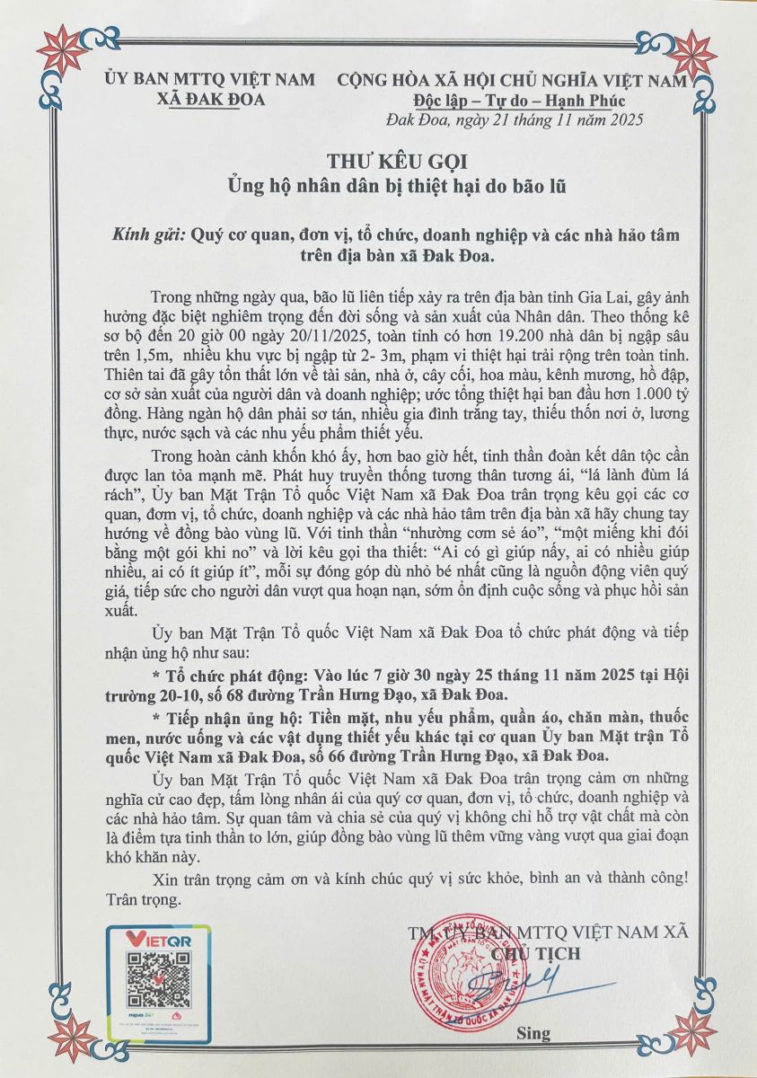 * Tiếp nhận ủng hộ: Tiền mặt, nhu yếu phẩm, quần áo, chăn màn, thuốc men, nước uống và các vật dụng thiết yếu khác tại cơ quan Uỷ ban Mặt trận Tổ quốc Việt Nam xã Đak Đoa, số 66 Trần Hưng Đạo, xã Đak Đoa, tỉnh Gia Lai.