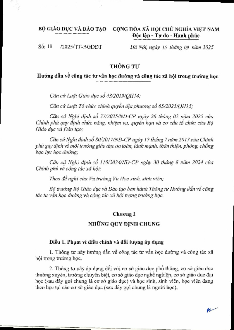 | Tiêu đề văn bản | Thông tư 18/2025/TT-BGDĐT Hướng dẫn về Công tác Tư vấn học đường và công tác xã hội trong trường học | ||